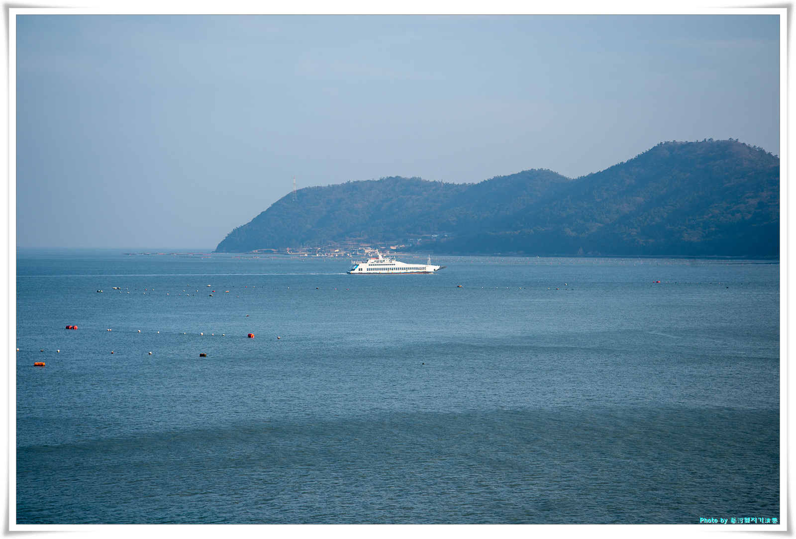 바다에는 선착장이 보이고 또 양식장이 조성되어 있고 섬과 섬을 이어주는 오가는 선박들이 보인다.