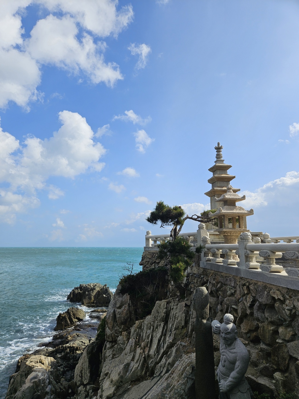 용궁사는 해안 사찰이다. 우리 나라 대부분의 사찰이 산에 있는 것과는 대조적이다. 좁고 짧은 대나무 사잇길을 지나면 갑자기 바다와 너른 경내가 펼쳐지는데, 아찔했다. 넥타이로 목을 조르듯 꽉 묶여서 그 갑갑함에 익숙해진체 보내던 일상에서 갑자기 터저나오듯 펼쳐지는 바다와 사찰의 모습은 엄청난 해방감으로 다가왔다. 사람이 아무리 많아도, 바다와 하늘, 사찰이 만나는 그 오묘한 균형감은 내 가슴에 고요를 주었다.