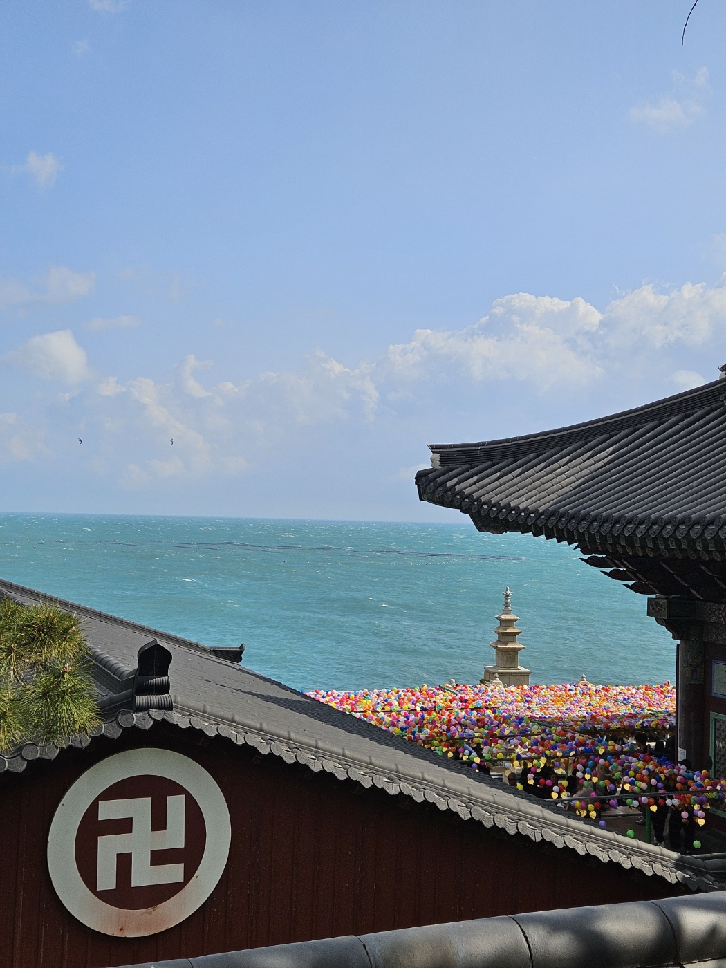 불교란 것이 원래 종교가 아니고 부처의 가르침이건만, 우리나라 절에는 각종 기복신앙과 민간신앙이 덧칠되어서 세속적인 소원빌기가 난무한다. 해동 용궁사도 마찬가지였다. 동전던지며 소원빌기, 석상 만지고 득남하기, 소원등달기, 등등 끝도 없는 세속적 욕망의 세트가 펼쳐진다. 지붕에 그려진 원안의 세개의 점이 부처님의 가르침과, 수행공동체...뭐 그런걸 상징한다고 하는데, 부처님의 가르침과는 대조적인 색색깔 연등이 비빔밥 처럼 아름답다. 원래 하나만 있으면 이쁜줄 모른다. 대조적인 것이 섞여 있어야 비교가 되면서 아름다움이 더 돋보이고, 조화로운 것이다. 사는게 참 요지경이다.