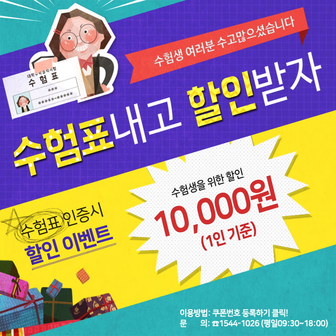 ![]() [이용방법] 1. 여행날짜를 선택하여 예약가능 여부 확인 2. 삼성여행사로 제주도 여행 예약 3. 예약시 담당직원에게 "수능할인쿠폰" 이용요청 4. 쿠폰번호와 수험표를 카카오톡으로 전송 5. 즐겁게 여행 다녀오기 [유의사항] -2018.02.09까지 출발상품에 한하여 이용가능 -제주도 관광패키지 상품에 한하여 이용가능 (예약가능한 상품 확인하러 가기☞ https://goo.gl/TUA2uS) -특가상품 등 일부 상품 적용 불가 -여행일행에 수험생 본인이 있을 경우에만 이용가능 -수험표 1개당 한번만 쿠폰이용 가능 -쿠폰발행 후 신규 예약건에 한하여 적용 |